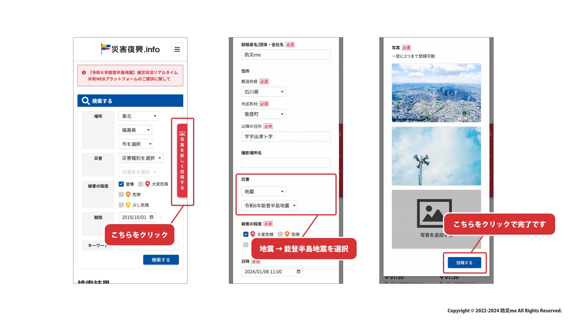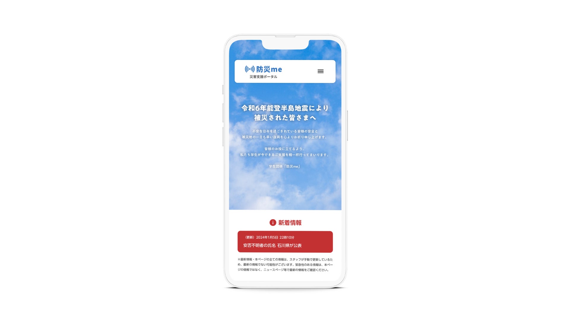 学生団体 防災me(所在地:福島県郡山市、代表:隂山弘暉、以下:防災me)は、2024年1月6日(土)より「令和6年能登半島地震」により被災された地域の復興に貢献するべく、2つのサービスの無償提供を開始いたします。