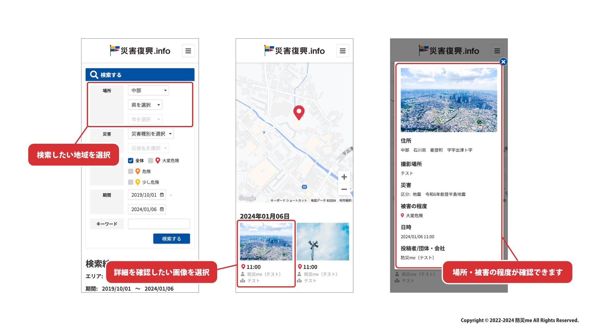 本製品は、被災状況リアルタイム共有WEBプラットフォームで、画像と詳細情報をつけて各地の情報を、インターネットを通して全世界に発信することができる(写真投稿機能)ほか、募金情報の掲載を行うこと、ボランティア支援や、必要資材・食料品等をマッチングすることが可能です。(URL:https://saigaifukko.info)